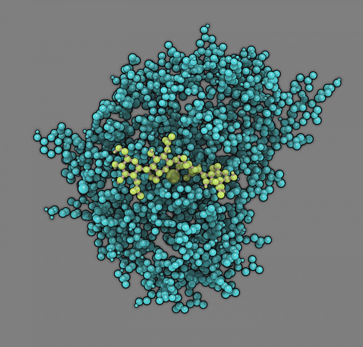 image: Model of the enzyme chitosan deacetylase (turquoise) with its substrate chitosan (light green) bound in its active site.