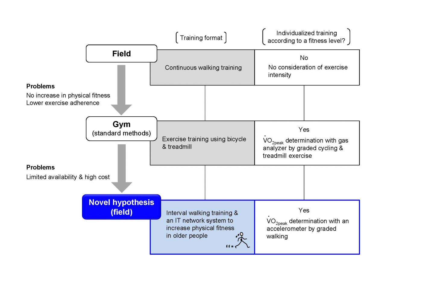 The team developed a training system using the internet of things (IoT) to motivate and track the exercise intensity levels of the trainees. The team found that with five months of training, a group with an average age of 63 were able to increase their physical fitness back to a level 10 years younger than they previously scored before the exercise protocol. Expensive machines and gyms are not necessary to achieve these results. With the use of triaxial accelerometer and the "3-step step-up walking method", researchers are able to measure physical fitness accurately and monitor exercise intensity during training. The method to increase physical fitness to a level 10 years younger utilizes the IWT, to walk at a speed of more than 70% of maximum effort for 3 minutes, and switch to a 40% capacity for another 3 minutes and repeat. To increase physical fitness, the key is the amount of time spent walking at a level of 70% or more, which the walker feels is sufficiently strenuous.