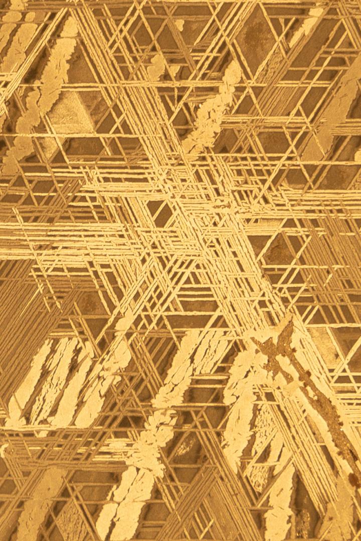 image: A beautiful illustration of the Widmanstatten pattern, which is characteristic of iron meteorites.