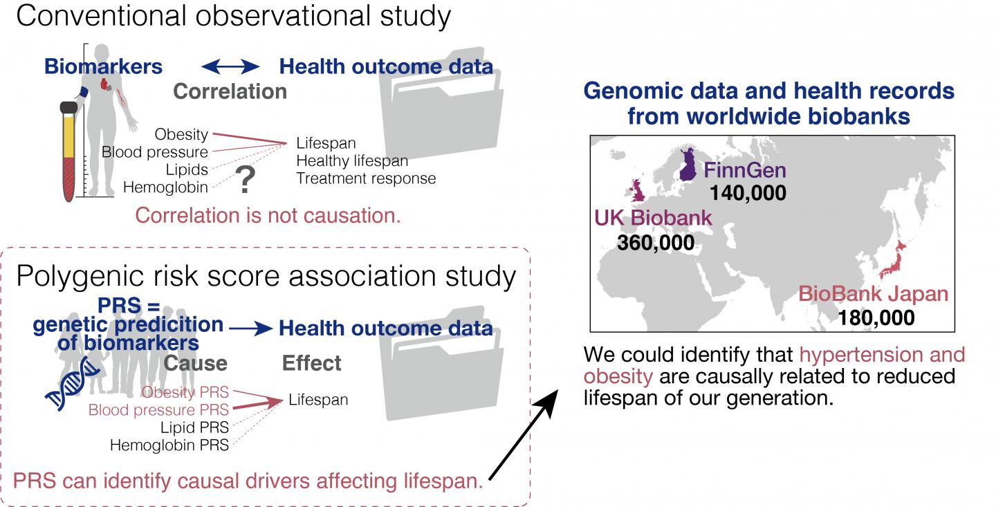 To achieve their goal, the researchers analyzed genetic and clinical information of 700,000 individuals from biobanks in the UK, Finland and Japan. From these data, the researchers calculated polygenic risk scores, which are an estimate of genetic susceptibility to a biological trait, such as a risk for disease, to find out which risk factor causally influences lifespan.