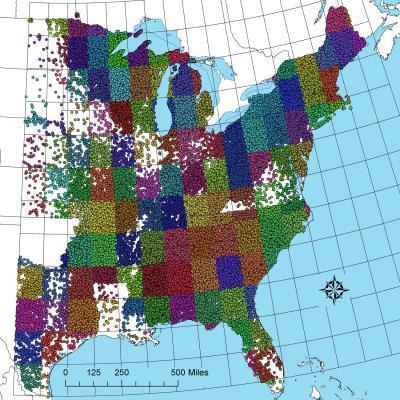 Data from over 3 million trees in the eastern half of the US were aggregated into two-degree-latitude-by-longitude cells in order to study regional patterns of conspecific negative density dependence, a process where the mortality of a species rises in coincidence with its increasing abundance.