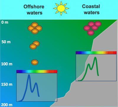 "These 'chromatic adapters' are true chameleons that can efficiently live in green coastal waters as well as in blue offshore waters by modifying their pigmentation," Kehoe said. "Synechococcus cells maintained in blue light harvest preferentially blue light, while cells grown in green light harvest more green."
