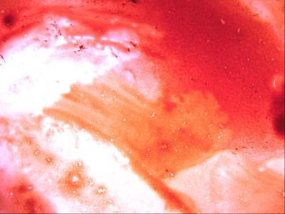 A mixed population of wild type (orange) and mutant (pink) Synechococcus cells grown in blue light. The wild type cells acclimated normally while mutant cells failed, remaining pigmented as if in green light.