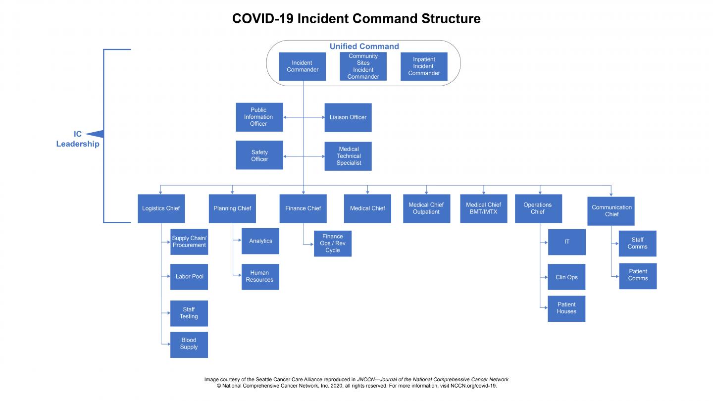 The article stresses the importance of keeping channels of communication open between administrators and staff, patients, caregivers, and the general public. The authors recommend forming an Incident Command Structure (as illustrated below) to provide early coordination of institution-wide efforts and to rapidly respond to changing information. They highlight the need to remain flexible and ready for unexpected challenges.