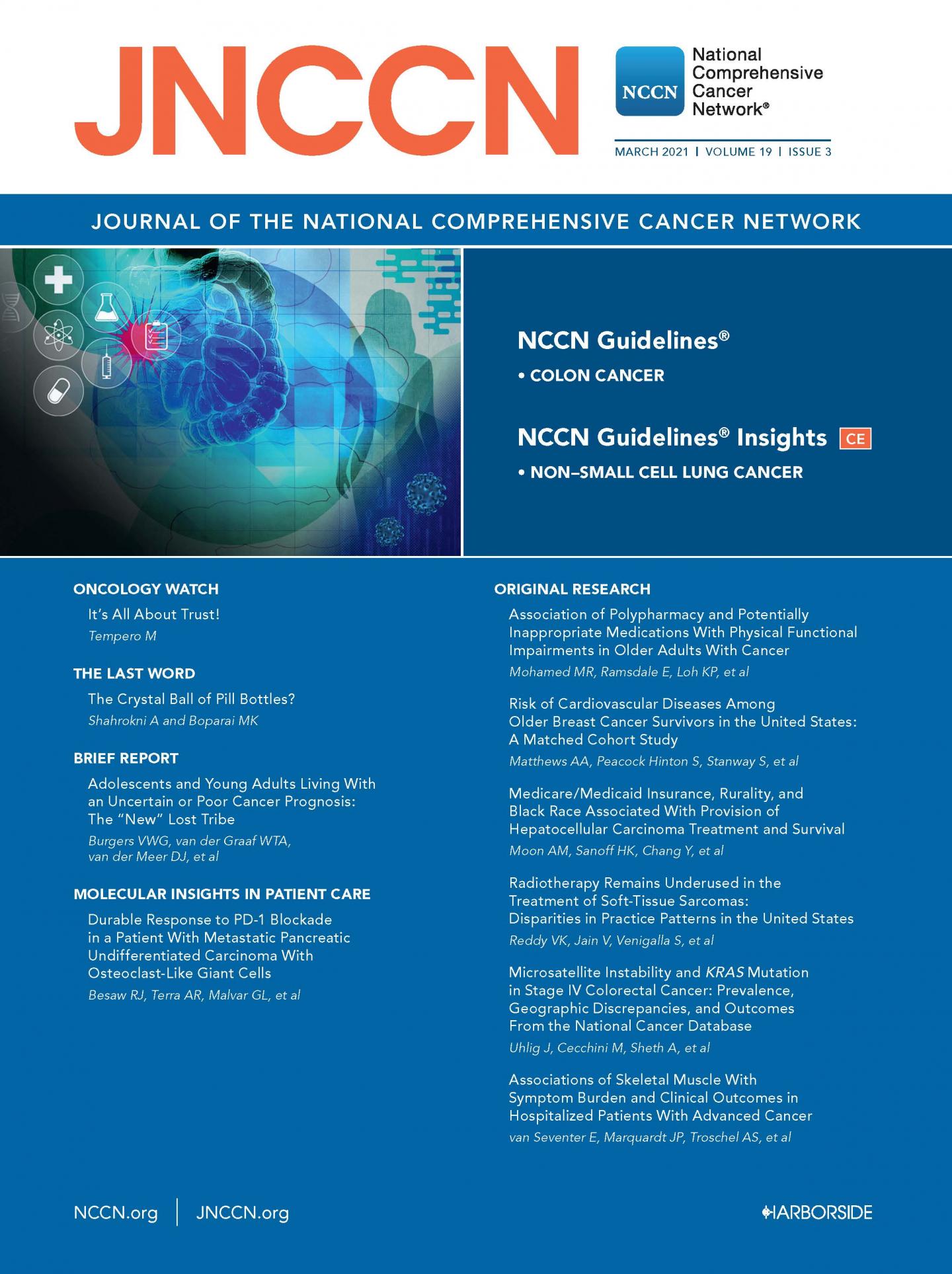 PLYMOUTH MEETING, PA [March 9, 2021] -- New research in the March 2021 issue of JNCCN--Journal of the National Comprehensive Cancer Network from Mass General Hospital Cancer Center, Harvard Medical School, and Dana-Farber Cancer Institute finds muscle mass (quantity) correlated with survival, while muscle radiodensity (quality) was associated with symptom burden, healthcare use, and survival in patients with advanced cancer undergoing an unplanned hospitalization. The researchers also found nearly two-thirds of the patients in that population had significant muscle loss (sarcopenia), and that those with a higher body mass index (BMI) tended to have lower muscle quality despite higher quantity. They highlight the need for additional work to continue investigating how best to utilize computerized tomography (CT) scans to measure muscle mass and density to improve clinical outcomes.