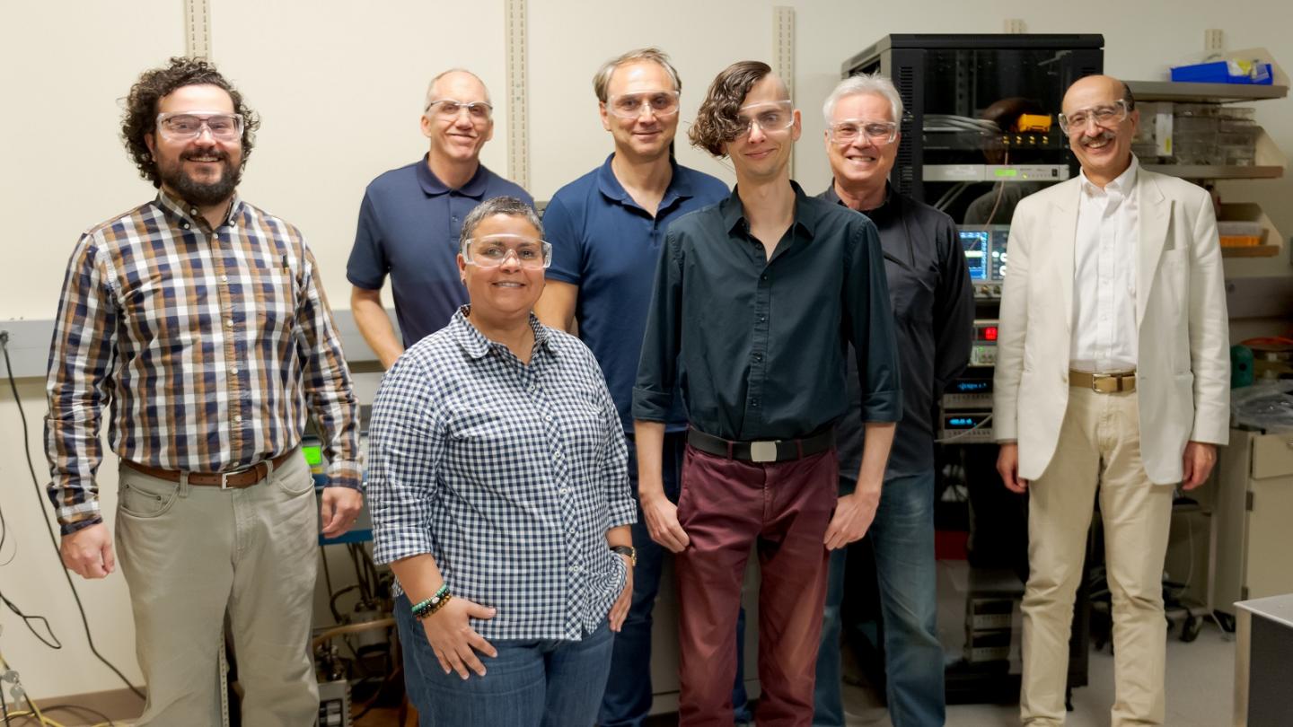 image: Superconducting nanowire team at Argonne. Left to right: Whitney Armstrong, John Pearson, Kawtar Hafidi, Valentine Novosad, Tomas Polakovic, Volodymyr Yefremenko and Zein-Eddine Meziani. Not shown: Goran Karapetrov (Drexel University).