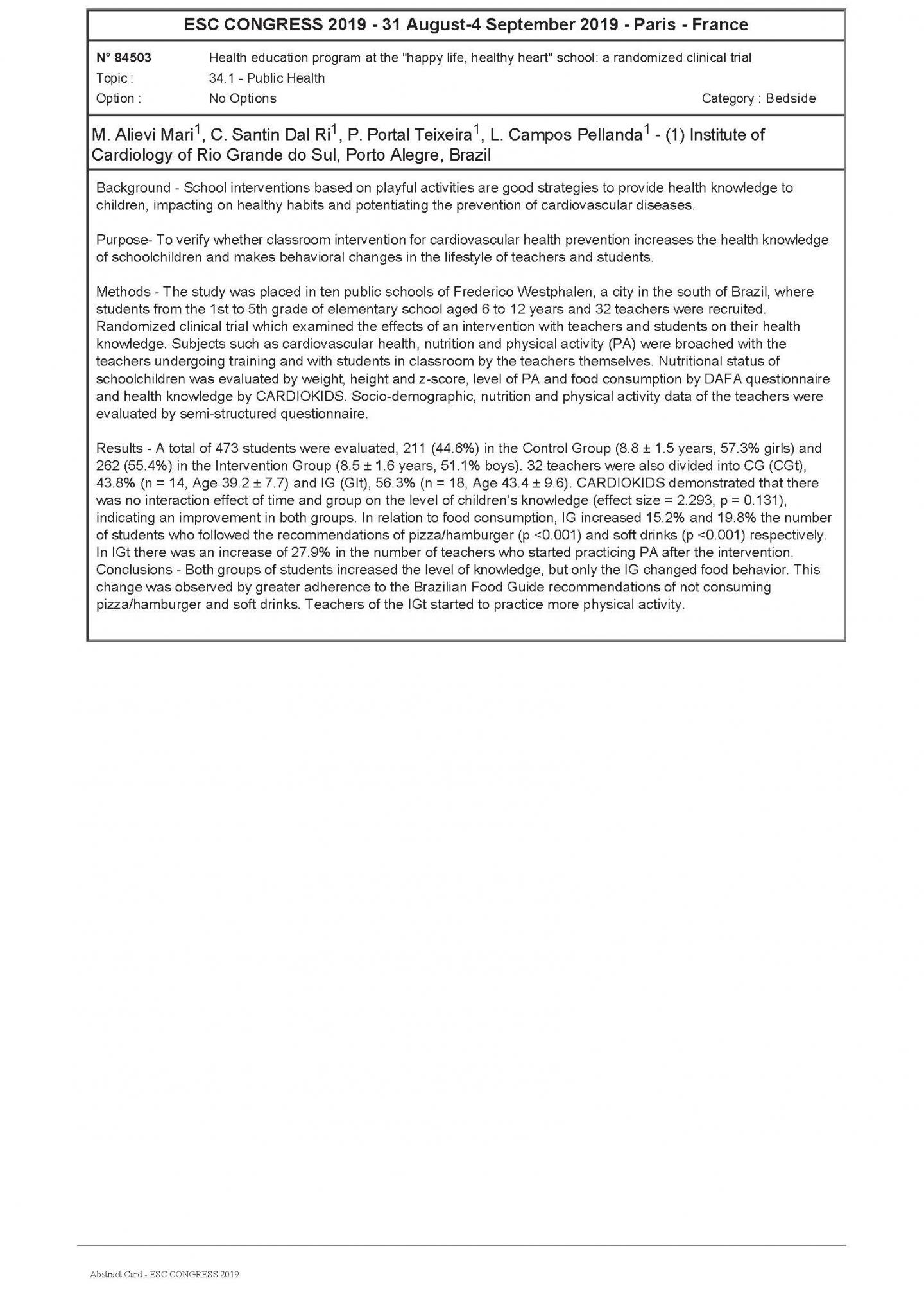 The Happy Life, Healthy Heart programme randomly allocated ten public schools in the city of Frederico Westphalen, Brazil, to the intervention group (five schools) or control group (five schools). The study included 473 students aged 6 to 12 and 32 teachers. Baseline assessments included weight, height, physical activity, food intake, and health knowledge in children; and physical activity and food consumption in teachers. Measurements were repeated after the intervention was completed.