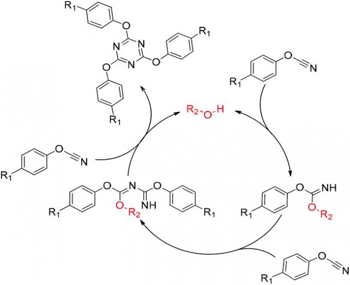 image: Mechanism of cyclotrimerization of cyanate esters.