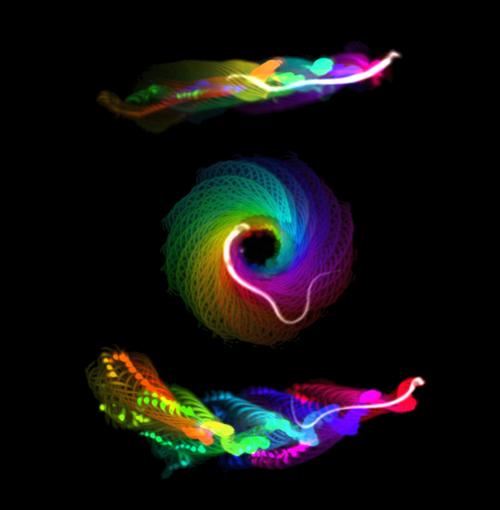image: Computer-assisted analysis of light microscopy data showing the linear swimming path of a normal sperm (top) and the abnormal circular and diagonal swimming paths of the mutant sperms (middle and bottom) that lack tubulin glycylation.