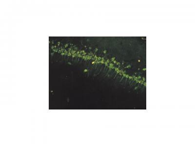 Neurons (green) in a subsection of the adult rat hippocampus, the brain's memory hub, are stained with a monoclonal antibody (yellow) that enhances learning and memory. A portion of this antibody is where the putative antidepressant GLYX-13 came from.