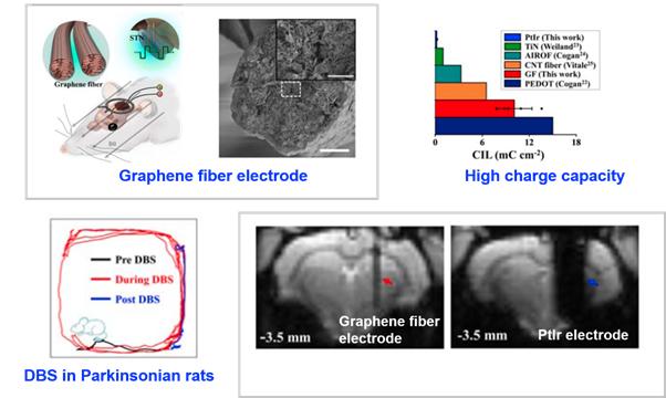 Recently, collaboration between Dr. Duan Xiaojie's group (Department of Biomedical Engineering, College of Engineering, Peking University) and Dr. Liang Zhifeng's group (Institute of Neuroscience, Center for Excellence in Brain Science and Intelligence Technology, CAS) has led to a novel MRI compatible, graphene fiber DBS electrode. Using a Parkinsonian rat model, this novel electrode achieved full activation pattern mapping by simultaneous deep brain stimulation and fMRI, and revealed close relationship between fMRI activation and DBS therapeutic improvement.