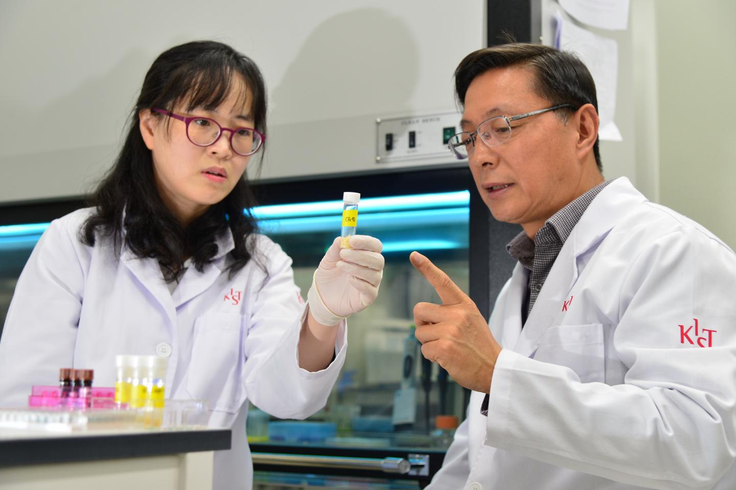 image: Dr. Keum Gyo-chang(right) and Dr. Bang Eun-kyoung(left) from the KIST's Center for Neuro-Medicine are discussing the efficacy of RNA stabilizer containing zinc complex.
