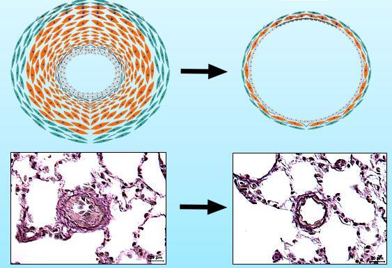 FoxO1 halts unrestrained cell division in pulmonary arteries. The images show photomicrographs of pulmonary arteries of rats with pulmonary hypertension. Whereas the blood vessel of an untreated rat is drastically reduced in diameter (left image), the vessel wall is essentially normalized after activation of FoxO1 (right).