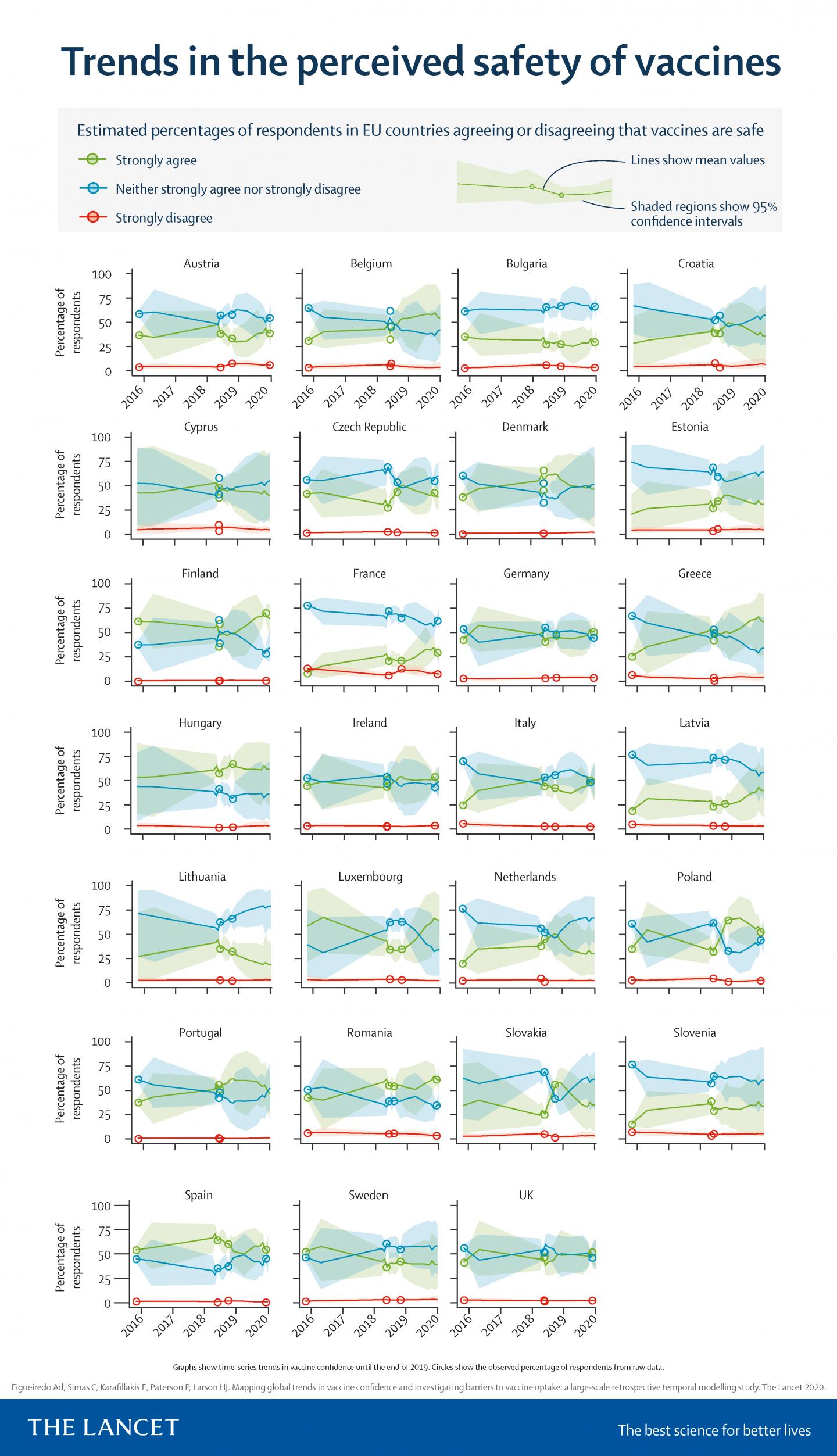 In this study, researchers analysed data from 290 nationally representative surveys conducted between September 2015 and December 2019--combining previously published data from nearly 250,000 survey responses with 50,000 additional interviews from 2019. Modelling was used to estimate trends in public perceptions about the safety and effectiveness of vaccines, and the importance of vaccinating children. They also modelled the relationship between vaccine uptake in each country and demographics (ie, age, sex, religious beliefs), socioeconomic factors (eg, income, education), and source of trust (eg, family, friends, health professionals). Estimates of vaccine confidence for some countries includes wide confidence intervals reflecting lower numbers of recent data--for these countries, the estimates are a weighting of the countries' overall trend and the trend of the whole continent.