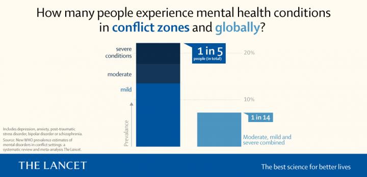 One in five people (22%) living in an area affected by conflict has depression, anxiety, post-traumatic stress disorder, bipolar disorder or schizophrenia, and about 9% of conflict-affected populations have a moderate to severe mental health condition, according to an analysis of 129 studies published in The Lancet. The figures are substantially higher than the global estimate for these mental health conditions in the general population, which stands at one in 14 people (as shown in the Lancet infographic).