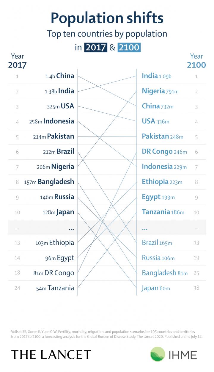 Dr Richard Horton, Editor-in-Chief, The Lancet, adds: "This important research charts a future we need to be planning for urgently. It offers a vision for radical shifts in geopolitical power, challenges myths about immigration, and underlines the importance of protecting and strengthening the sexual and reproductive rights of women. The 21st century will see a revolution in the story of our human civilisation. Africa and the Arab World will shape our future, while Europe and Asia will recede in their influence. By the end of the century, the world will be multipolar, with India, Nigeria, China, and the US the dominant powers. This will truly be a new world, one we should be preparing for today." [2]