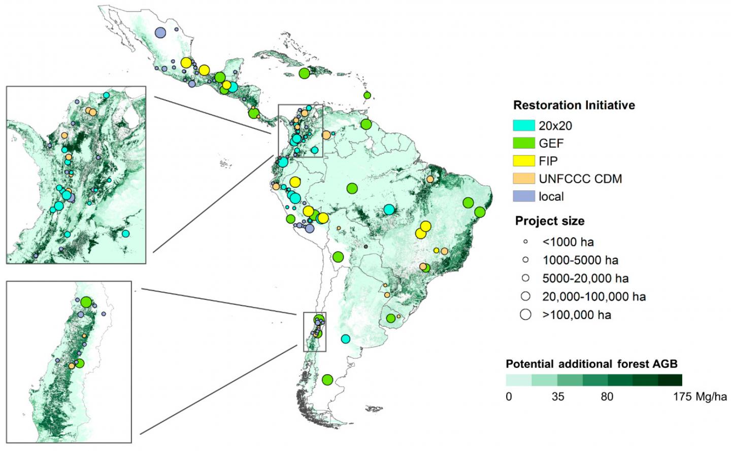 Researchers took stock of the location, goals and activities of 154 projects in Latin America and the Caribbean, starting a database to guide practitioners in scaling up restoration. They mapped projects under five initiatives working towards the Bonn Challenge goals - the 20x20 Initiative, the Global Environment Facility, the Clean Development Mechanism (CDM), the Forest Investment Program (FIP) and independent local projects - in tandem with mapping the potential biomass increase that forest restoration could achieve across the region's various ecosystems.