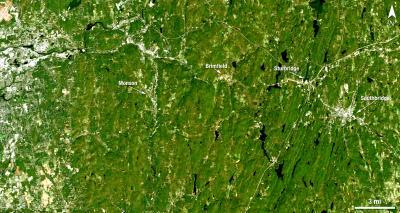 This is a Landsat 5 satellite image of the area between Springfield and Sturbridge, Mass. taken on June 5, 2011, that clearly shows the light-colored tornado track. * HIGHER RESOLUTION, with lines on image.