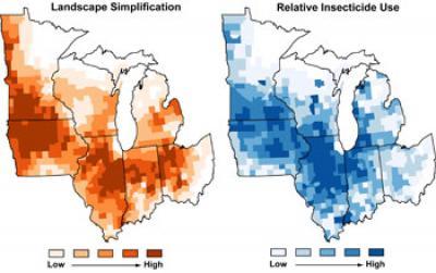 Simplified landscapes, with lots of cropland and little natural habitat, promote crop pests. These maps of the Midwest show landscape simplification on left and relative insecticide use on right.