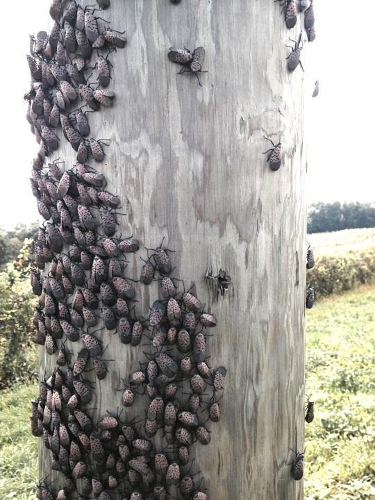 image: An accumulation of spotted lanternfly adults on the telephone pole at the study site on Sept. 26, 2018. Most of the lanternflies are quiescent, but some, at right, can be seen beginning to walk up the pole. One of the pests, shown in silhouette at bottom right, has its stylets inserted into the pole.