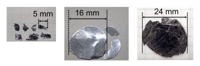 To solve the problem, the team designed an original feed composition used for the flux growth of SnS crystals. This is something that had not been successfully trialed before. A dramatic change appeared in the grown crystals by halogen addition, that is, enlargement of the crystal size to a maximum 24 mm in width (Figure 1), in addition to including an n-type conduction characteristic. The larger crystals lower the stakes of trial manufacturing the SnS solar cells with p-n homojunction, which accelerates the development for practical application.