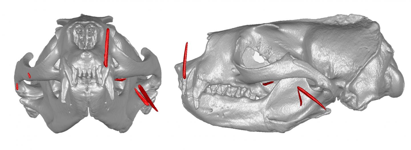 image: 3D models of fur seal skull showing the fish spines.
