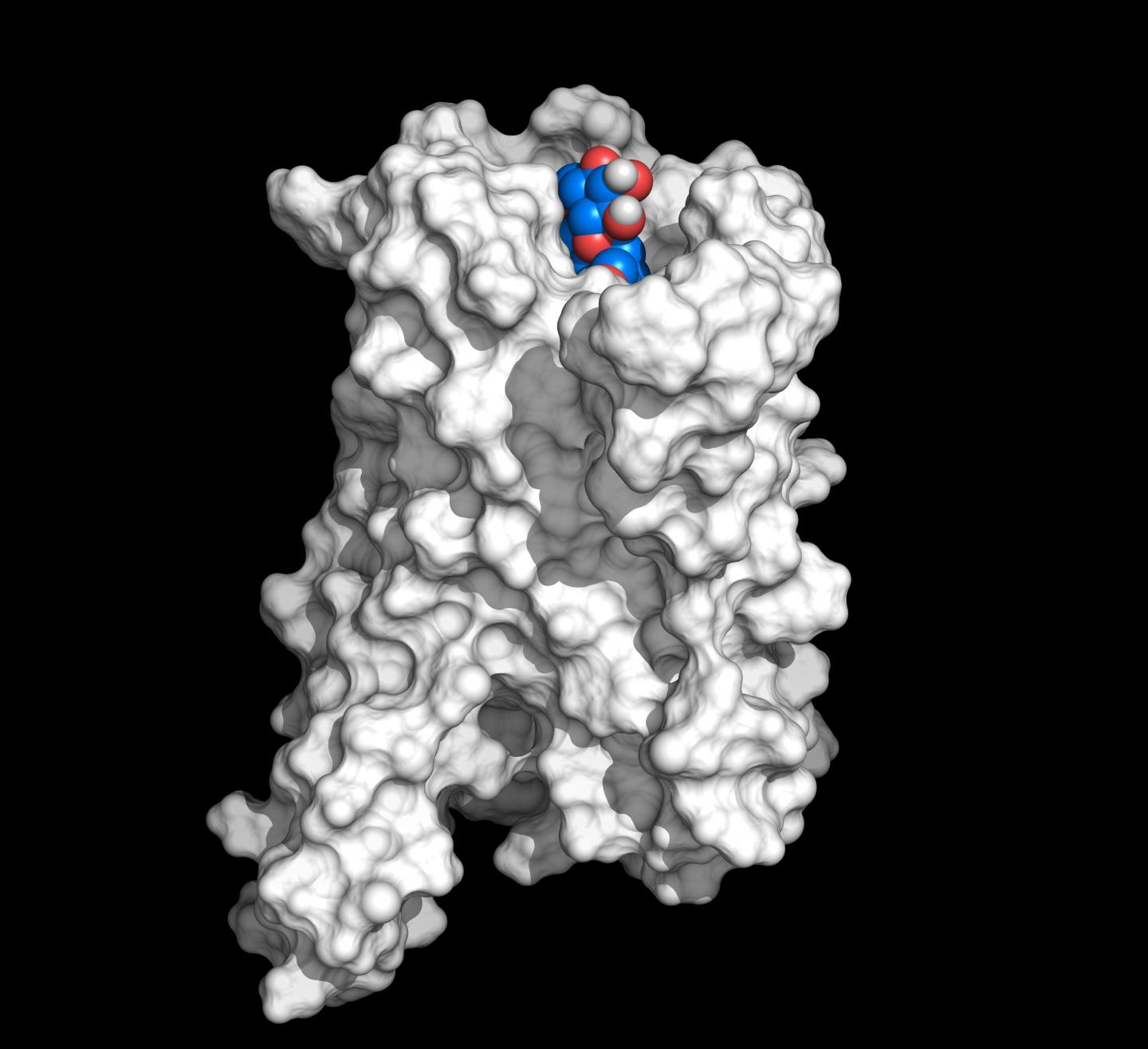 image: Model of the bitter receptor TAS2R43 without extracellular domain. Within the binding pocket: Model of the bitter substance mozambioside (blue).