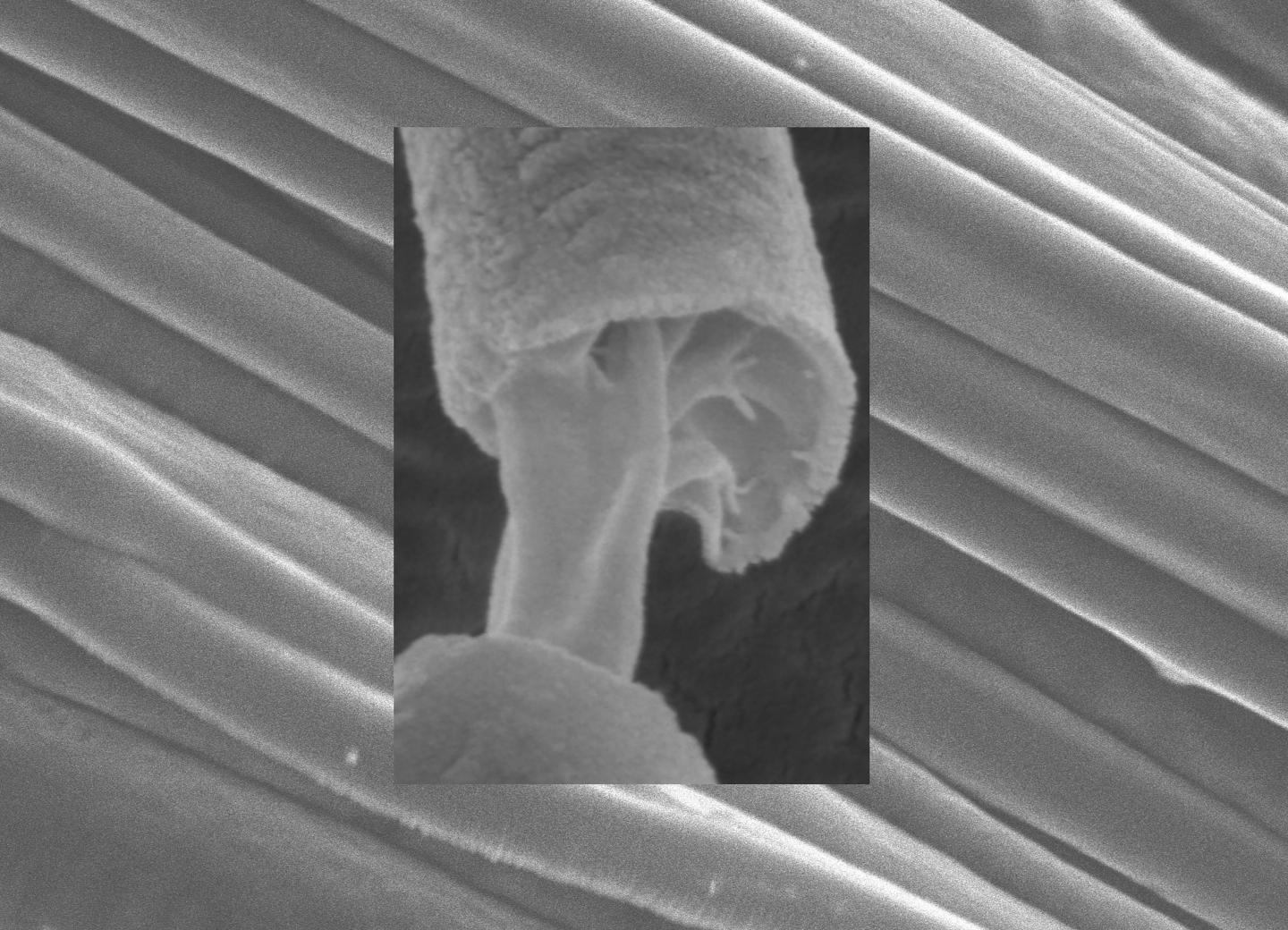 image: Aligned core-sheath fiber arrays mass-produced by pressurized gyration invented at UCL Mechanical Engineering with the core and sheath of the fibers clearly distinguishable by electron microscopy