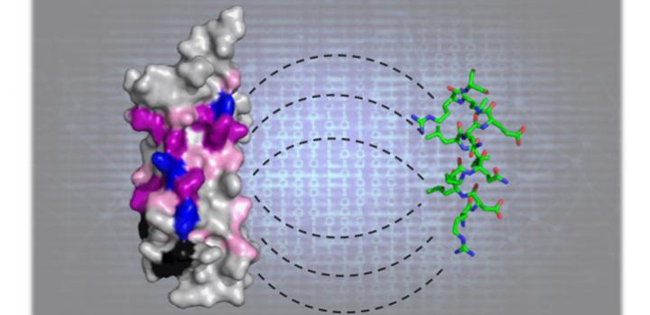 image: The researchers used AI methods to predict the interaction (shown by the dashed lines) of short, linear protein segments (green stick model) with their target proteins (molecular representation on the left). Predictions were experimentally confirmed as shown by the imprint of the ligand on the surface of the target protein (blue, magenta and pink colored surfaces).