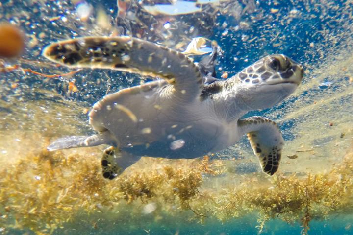 image: Oceanic stage green sea turtle released with solar-powered satellite tag in Sargassum habitat. Permit number NMFS-19508.