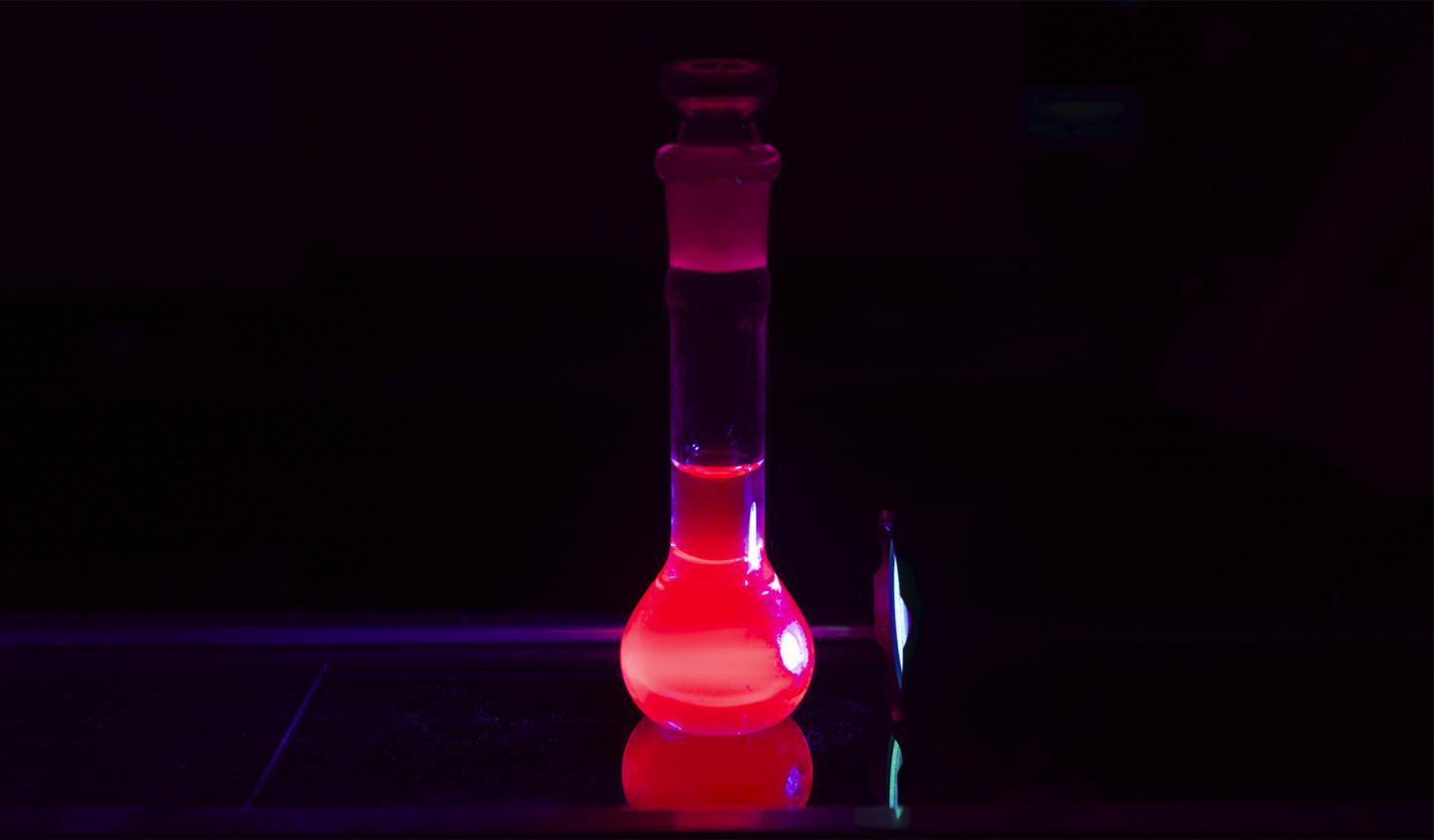 image: The europium Eu(III) complex with nanocarbon antenna emitting fine red light.