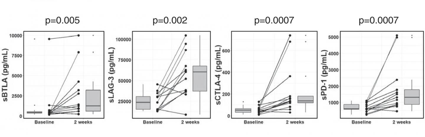 This study profiled the baseline levels of 16 soluble checkpoint proteins and their changes following sorafenib treatment for HCC. Plasma samples were obtained from 53 patients with advanced HCC at baseline, week 1, 2 and 4 of sorafenib treatment, and tested for the concentrations of soluble checkpoint proteins using multiplexed fluorescent bead-based immunoassays. Multivariate analysis showed high soluble B- and T-lymphocyte attenuator (sBTLA) levels at baseline were an independent predictor of poor overall survival (Fig. 1). BTLA (indicated by arrows) was highly expressed in T cells and macrophages in peritumoral areas (Fig. 2). At week 2, the concentrations of most inhibitory proteins, including sBTLA, sLAG3, sCTLA-4, and sPD-1, had significantly increased (Fig. 3). The fold-changes of soluble checkpoint receptors and their ligands, including sCTLA-4 with sCD80/sCD86, sPD-1 with sPD-L1; and the fold-changes of sCTLA-4 with sBTLA or sPD-1, were positively correlated (data not shown).