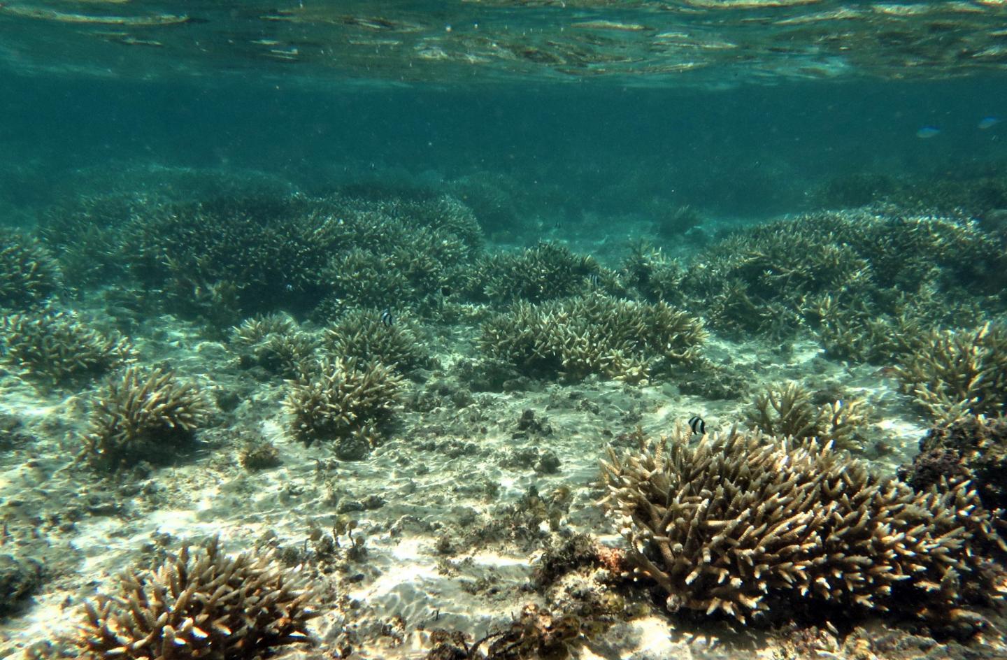 image: Staghorn corals in the reef flat off Hagåtña appear bleached as a response to stress from environmental changes. As one of Guam's dominant reef-builders whose habitat experiences temperatures up to 97 degrees Fahrenheit, this species was used in a University of Guam study published in February that found that shade can mitigate the effects of heat stress on corals.