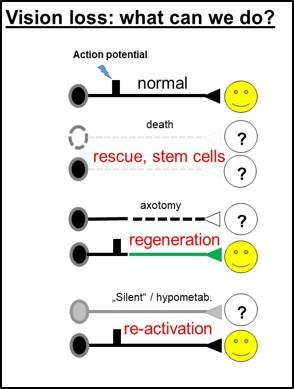 Neurons in the visual system can become silent because they are either anatomically or physiologically damaged, inhibited by toxic substances or lack of oxygen and glucose supply. From the clinical point of view, damaged cells in the visual system are not always dead, but may be inactive, in a hibernation-like mode, or in a hypometabolic stage. It may be possible to reactivate them through medication, training and/or electrical stimulation.