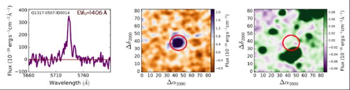 To overcome the obstacle that their target objects are dark, the team used a flashlight of sorts, which came in the form of quasars. These emit intense ultraviolet light, which in turn induces fluorescent emission in hydrogen atoms known as the Lyman-alpha line. As a result, the signal from any dark galaxies in the vicinity of the quasar gets a boost, making them visible. Such 'fluorescent illumination' has been used before in searches for dark galaxies, but Marino et al. now looked at the neighbourhood of quasars at greater distances than has been possible in earlier observations.