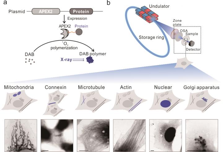 Microscopic visualization of sub-cellular structures and constituents plays a central role in cell biology. Synchrotron-based X-ray microscopy (XRM) provides a unique approach for direct imaging a whole cell with intrinsic nanoscale resolution. However, existing approaches to label biomolecules rely on the use of exogeneous tags that are multi-step and error-prone (e. g. antibody-based detection). Recently, Chunhai Fan from Shanghai Jiao Tong University, Ying Zhu, Jun Hu and Lihua Wang from the Shanghai Synchrotron Lightsource developed genetically-encoded tags for XRM imaging, which allows nanoscale localization of proteins in cells.