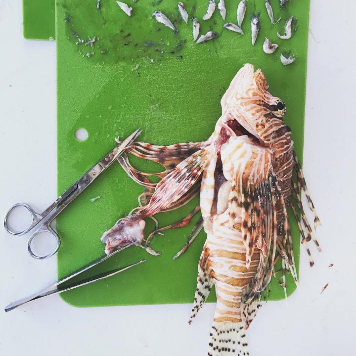image: Airey dissects lionfish captured at different depths and habitats to find out where they have lived. Photo courtesy of Montana Airey.