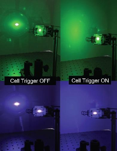 image: Liquid crystals sandwiched between two1-inch squares of glass scatter green and blue light on a wall when the cells are triggered by laser illumination (right panels).