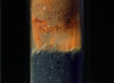 A small cavity in the seabed reveals a number of cable bacteria that conducts electric currents between the red surface and the deep, black, anaerobic sediment layers of the seabed.