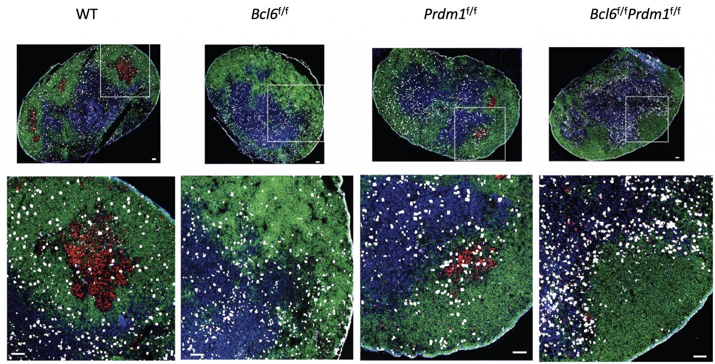 image: Bcl6 prompts helper T cells to become T follicular helper cells (Tfh cells, shown in blue), which work with B cells (shown in green) to produce powerful antibodies. Activated B cells give rise germinal centers (shown in red), where mature B cells proliferate and produce highly specific antibodies against pathogens. Bcl6 blocks the expression of two proteins that normally stop Tfh cell differentiation. When Bcl6 does its job, helper T cells are free to become Tfh cells when the body needs them.