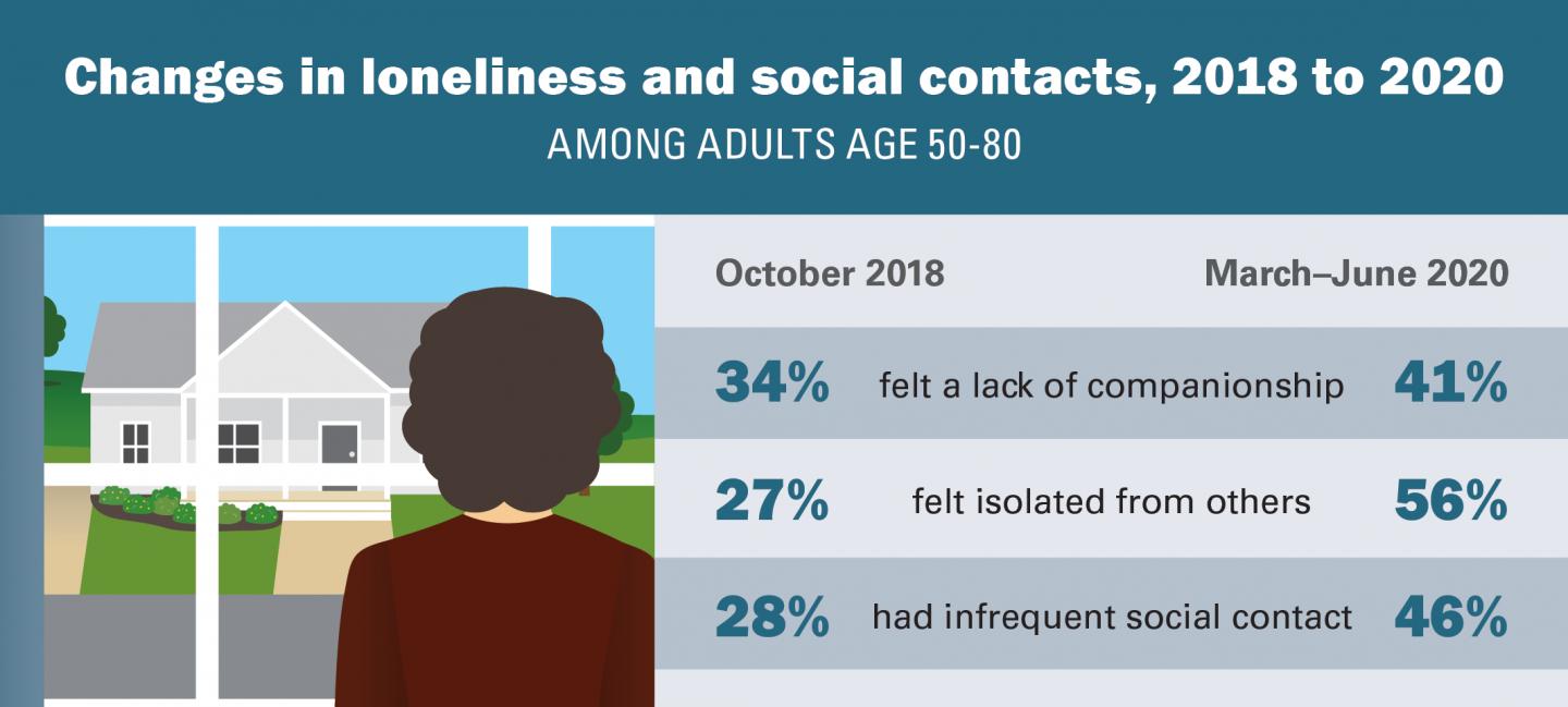 In June of this year, 56% of people over the age of 50 said they sometimes or often felt isolated from others - more than double the 27% who felt that way in a similar poll in 2018. Nearly half of those polled in June of this year also said they felt more isolated than they had just before the pandemic arrived in the United States, and a third said they felt they had less companionship than before.
