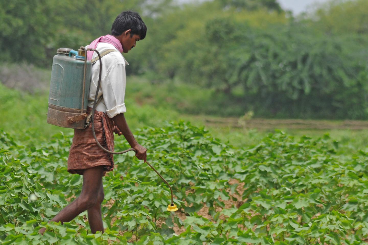 image: An Indian farmer applies pesticide to his cotton field.