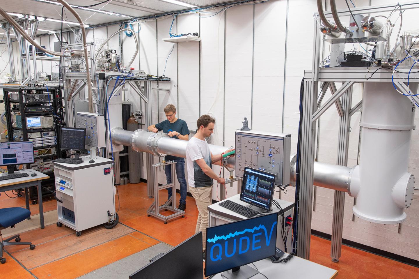 Each of the quantum chips is cooled down over several days in a cryostat (an extremely powerful refrigerator), using compressed and also liquid helium, to a few hundredths of a degree above absolute zero. To that end, the five-metre waveguide that creates the quantum link was equipped with a shell consisting of several layers of copper sheet. Each of those sheets acts as a heat shield for the different temperature stages of the cryostat: -223 degrees, -269 degrees, -272 degrees and finally -273,1 degrees. Altogether, those heat shields alone weigh around a quarter of a tonne.