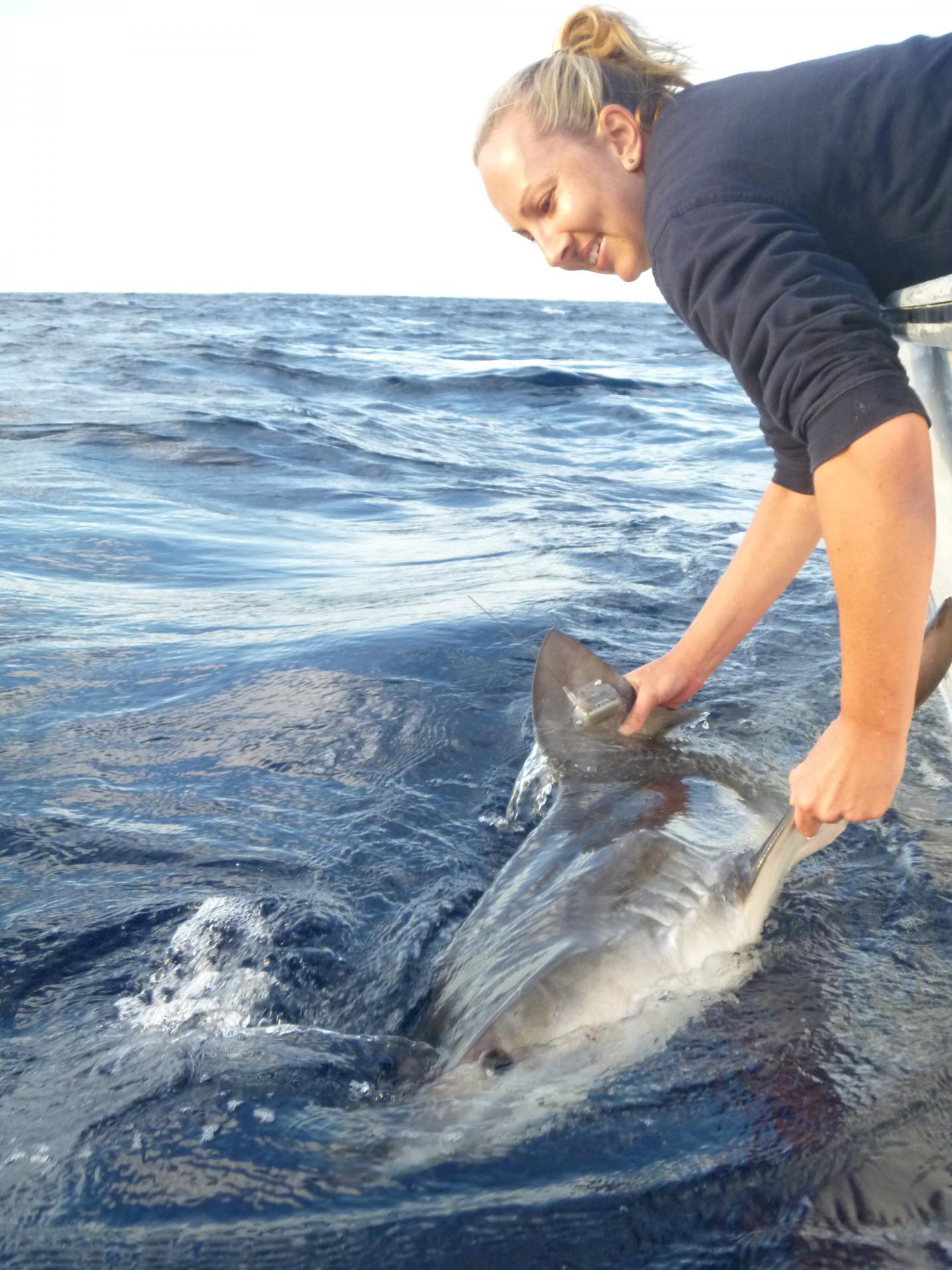 image: Dr Bonnie Holmes tagging and monitoring sharks in the open ocean.