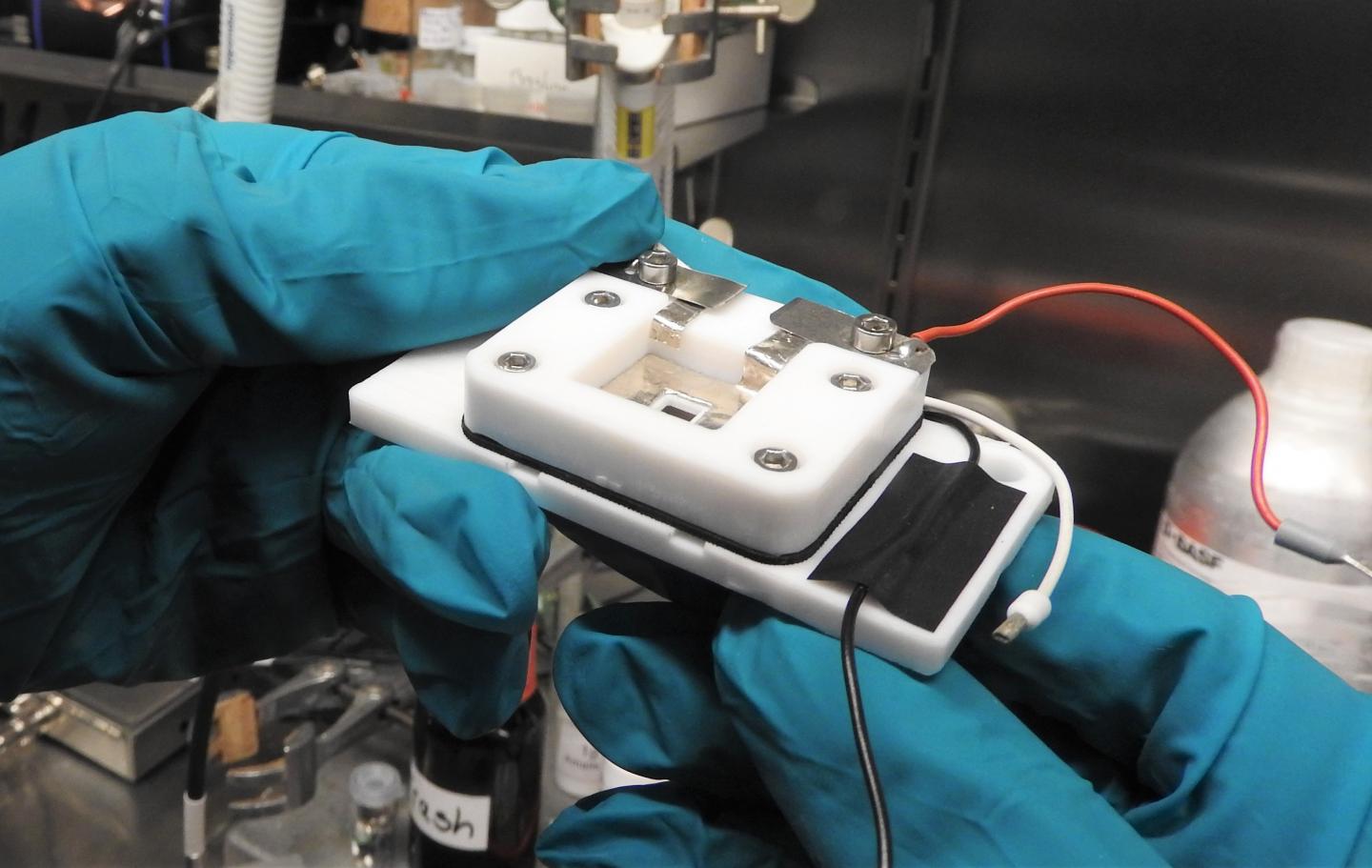 image: In a measuring cell developed in-house, the Oldenburg team examined lithium electrodes using electrochemical scanning microscopy.