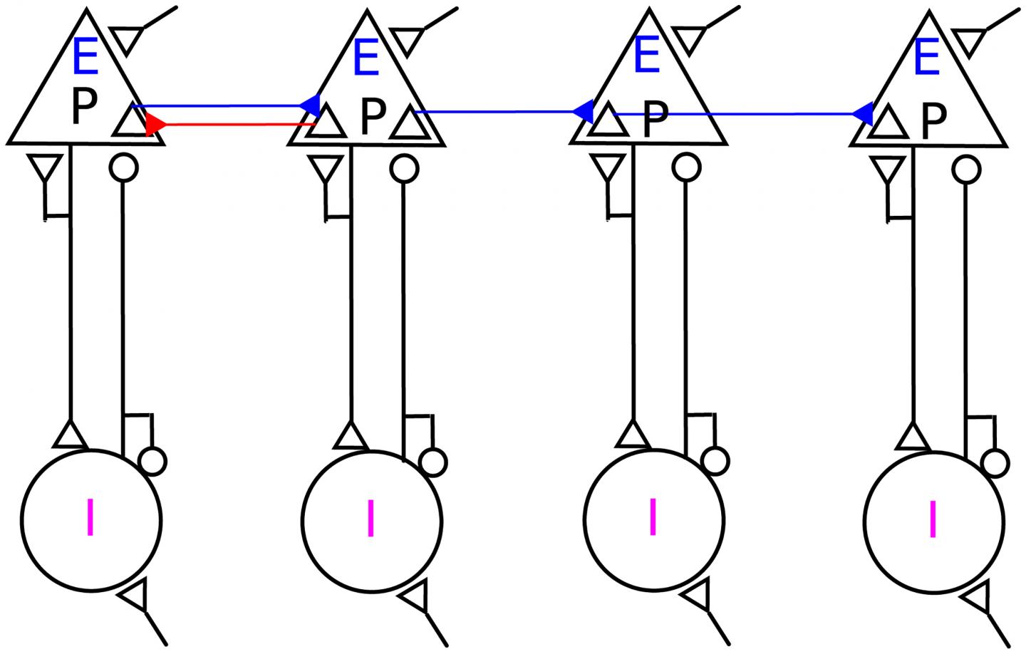 image: Schematic depiction of a network of networks with one resonance pair: 200 excitatory neurons (E) in each network, including 70 projecting neurons (P) and 50 inhibitory neurons (I), have random, homogenous, sparsely returning connectivity. EE connectivity - shown with blue arrows -- sparsely links several networks in a feedforward-way. The red arrow from Network 2 to Network 1 shows sparse, random feedback loops from the second to the first EI network, which designates both networks as a resonance pair here.