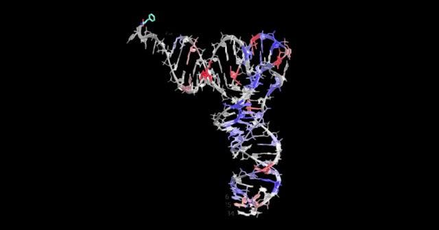 video: In this animation, the research team indicates where they observed variants in the tRNA structure. The blue represents areas that were found to be less frequently mutated and red represents areas more frequently mutated.