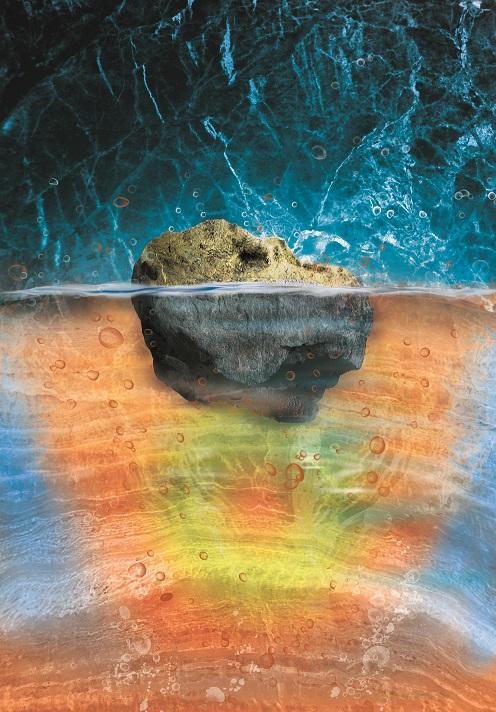 image: The schematic artwork shows a boundary within the lower mantle at the depth of 1900 km. Below 1900 km, the interaction between water and mantle is triggered.