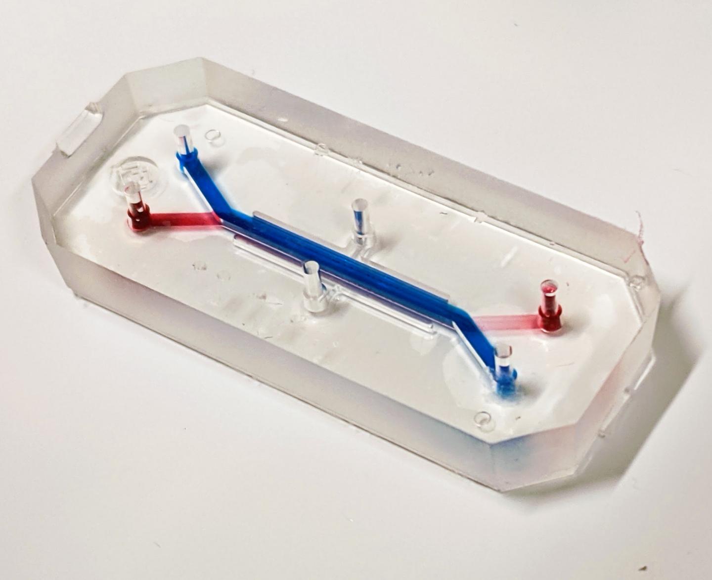 image: A close-up image of the lung-on-chip model used in the study. The endothelial or vascular channel is highlighted with a red food colouring dye, and the epithelial or airway channel is highlighted with a blue food colouring dye. The design allows for a co-culture of the cells from the two channels in the middle of the chip.
