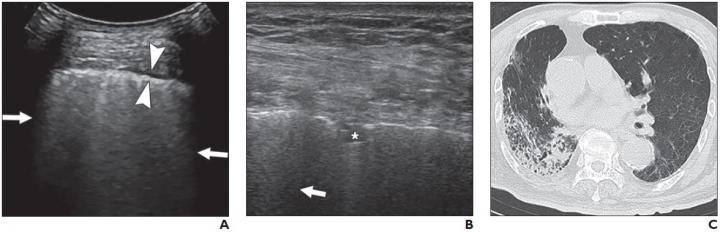 image: A and B, Lung ultrasound images obtained with convex (A) and linear (B) probes. Multiple confluent B-lines (arrows), patchy pulmonary consolidation (asterisk, B), and thickened pleural line (between arrowheads, A) are visualized. C, Chest CT image shows reticular and interlobular septal thickening and patchy, focal opacities associated with architectural distortion. This patient was classified in critical group and was assigned to severe group for statistical analysis.